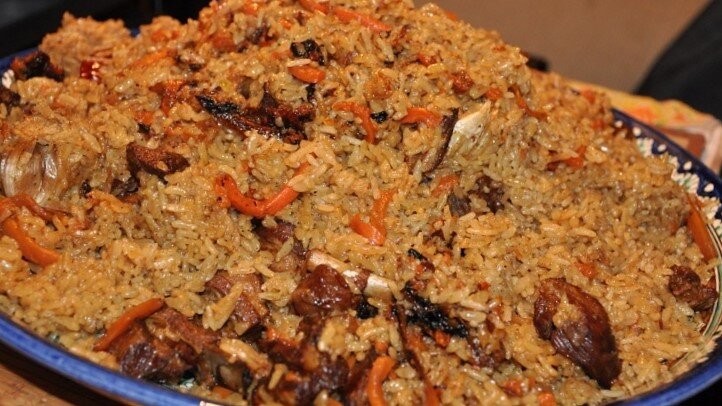 Риштанский плов многие называют самым знаменитым узбекским пловом. На самом деле Риштанский плов известен не более, чем Самаркандский, Хорезмский, Ташкентский или Бухарский. Риштан – это город в Ферганской области, где делают лучшую посуду для плова. И это уже не просто заявление, а подтвержденный факт. Теперь приступим к плову. Нам понадобится: Рис Девзира 1кг Курдюк 350г Лук 125г Баранина ребрышки 1000г Соль 30г Морковь 800г Зира 1 чайная ложка Барбарис 1 столовая ложка. Перец острый 1 стручок Чеснок 1-2 головки Рис тщательно промывается, заливается водой 70С. Курдючный жир топится в сотейнике на медленном огне или при начальной температуре 120С с последующим повышением до 180С (средний огонь). Шкварки откидываются. В сотейнике остается примерно 300г жира. В центр сотейника добавляется лук, а по краям мясо, нарезанное по одному ребру и соль. Когда мясо будет полностью колеровано, за 2-3 подхода добавляется морковь, нарезанная бруском 7-8мм. В сотейник добавляются специи и неочищенны