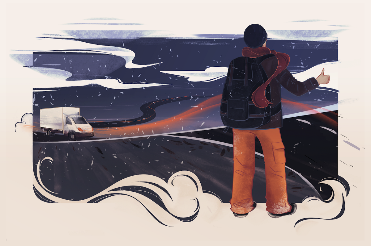 Наконец, выбравшись на трассу, я оказался по колено в грязном сугробе — горнолыжные штаны пришлись очень кстати. Оставалось оглядеться и выбрать самое яркое место на обочине — вот этот рекламный щит подойдет. Сверху вниз, с баннера на меня смотрела здоровенная бутылка колы. Уже через минуту, надев желтый светоотражающий жилет, держа рюкзак на плечах, я вытянул руку и начал голосовать.