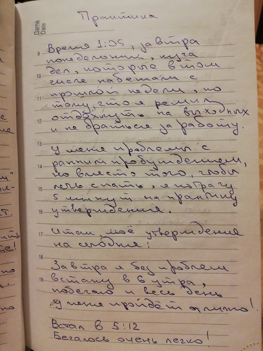 - Я записал в ежедневнике то, что я представил ранее (я без проблем встану рано утром, побегаю и весь день у меня пройдет отлично!). Важно не только представить то, чего ты хочешь, но и материализовать его. Записав то, чего я хочу на бумаге я не только материализовал желание, но и запрограммировал себя на это!