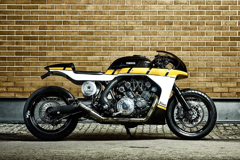 Португальские мастера на все руки it roCkS!bikes вернулись с еще одним проектом из серии Yard Built Yamaha. Их последнее творение – потрясающий VMAX CS_07 Gasoline. Алехандро Сантос и Освальдо Коутиньо не забыли вписать свои имена в имя мотоцикла – забавный префикс CS – это, собcтвенно, первые буквы их фамилий. В строительстве монокока ребята из Опорто выбрали отдельную радикальную философию, и мы поддерживаем их выбор. «Пауэркрузер» был превращен в драгстер с высоким сиденьем и удлиненной хвостовой частью. То, что логично выглядит как топливный бак, — на самом деле выполненная вручную имитация, так как бензин хранится в специальной емкости под сиденьем. Она снижает центр тяжести и улучшает управление на высоких скоростях, что крайне важно для дрэг-рэйсинга. Задний слик Mickey Thompson и уникальные 18-дюймовые диски полностью меняют правила игры. Оригинальный тахометр был сохранен и теперь вставлен в особый корпус. Среди важных нюансов – боковые подножки LSL, воздушный фильтр K&N, торм
