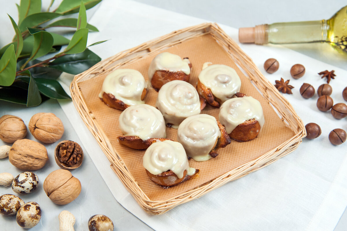 сливки — 40 г Способ приготовления 1. Подготовим опару: соединяем 7 г сухих дрожжей и 130 мл воды, перемешиваем. Добавляем 20 г сахара, оставляем на время для активации дрожжей. 2. В миске соединяем 100 г крахмала тапиоки, 100 г рисовой муки, 50 г гречневой муки, 50 г овсяной муки, 4 г кстантановой камеди, 20 г льняной муки и всё перемешиваем. Затем несколько раз просеиваем через сито. Вливаем опару. Добавляем 30 г сахара, 6 г соли, 100 г 20% сметаны, 2 яйца. Замешиваем руками. 3. Подготовим начинку: в миске соединяем 50 г 20% сметаны, 50 г сахара, 30 г миндальной муки, 10 г корицы и перемешиваем. 4. Рабочую поверхность подпыляем рисовой мукой. Раскатываем тесто в прямоугольник и переносим на пекарскую бумагу. 5. Покрываем поверхность начинкой, оставляя один край пустым. Смазываем этот край смесью яйца и воды. 6. Скручиваем в рулет и нарезаем. Заготовки смазываем яичной смесью и отправляем расстаиваться 30-40 минут. Ещё раз смазываем яичной смесью, посыпаем сахаром. Выпекаем в духо