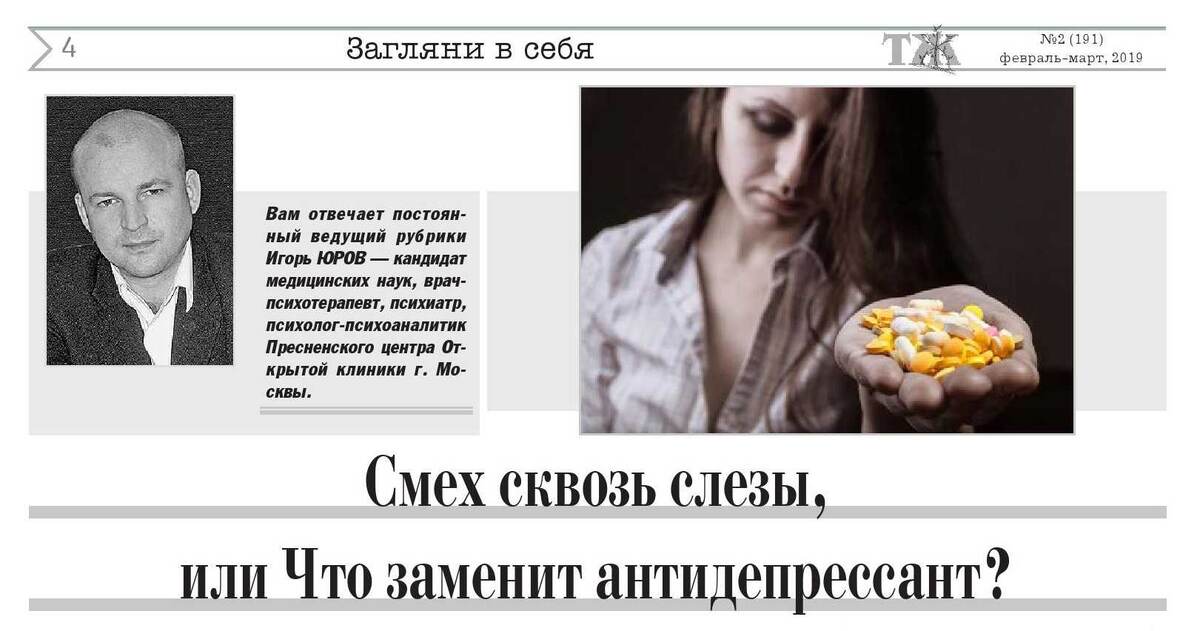 И, вот, этот «смех сквозь слезы» можно считать своеобразным тестом на предмет того, У КОГО ИМЕННО антидепрессанты «загоняют проблему внутрь», оставляя без внимания «истинную причину» расстройства? Тому, кто не расплакался и не рассмеялся над над данным или подобным ему перечнем лечебных процедур, исключающих медикаментозное лечение, кто может себе позволить, а главное – кто имеет силы в состоянии невроза или депрессии интенсивно «работать над собой», антидепрессант совершенно ни к чему! Такой человек не страдает от невроза или депрессии настолько, чтобы использовать медикаменты, подобно тому как и при легком насморке не следует сразу хвататься за таблетки.