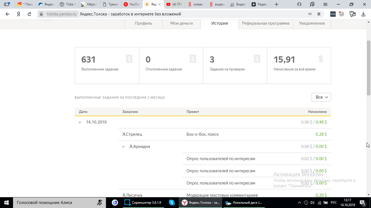 Осталась я без работы. Уже месяц как. ((( Увидела случайно кто-то писал про толоку. Вспомнила. Когда-то очень давно начинала я на ней выполнять задания, но что-то не срослось у меня с ней. И я ее бросила. Не понравилось. Так вот. Начала я выполнять задания и как-то меня увлекло. Вот мои результаты: За 631 выполненное задание почти 16 долларов. Хм. Думаю, что не плохо. Да, надо выполнять монотонные задания. Иногда интересные, иногда - нет. Но учитывая, что сидишь дома и не вкладывая ничего, можешь немного подзаработать. Спасибо за внимание!!!