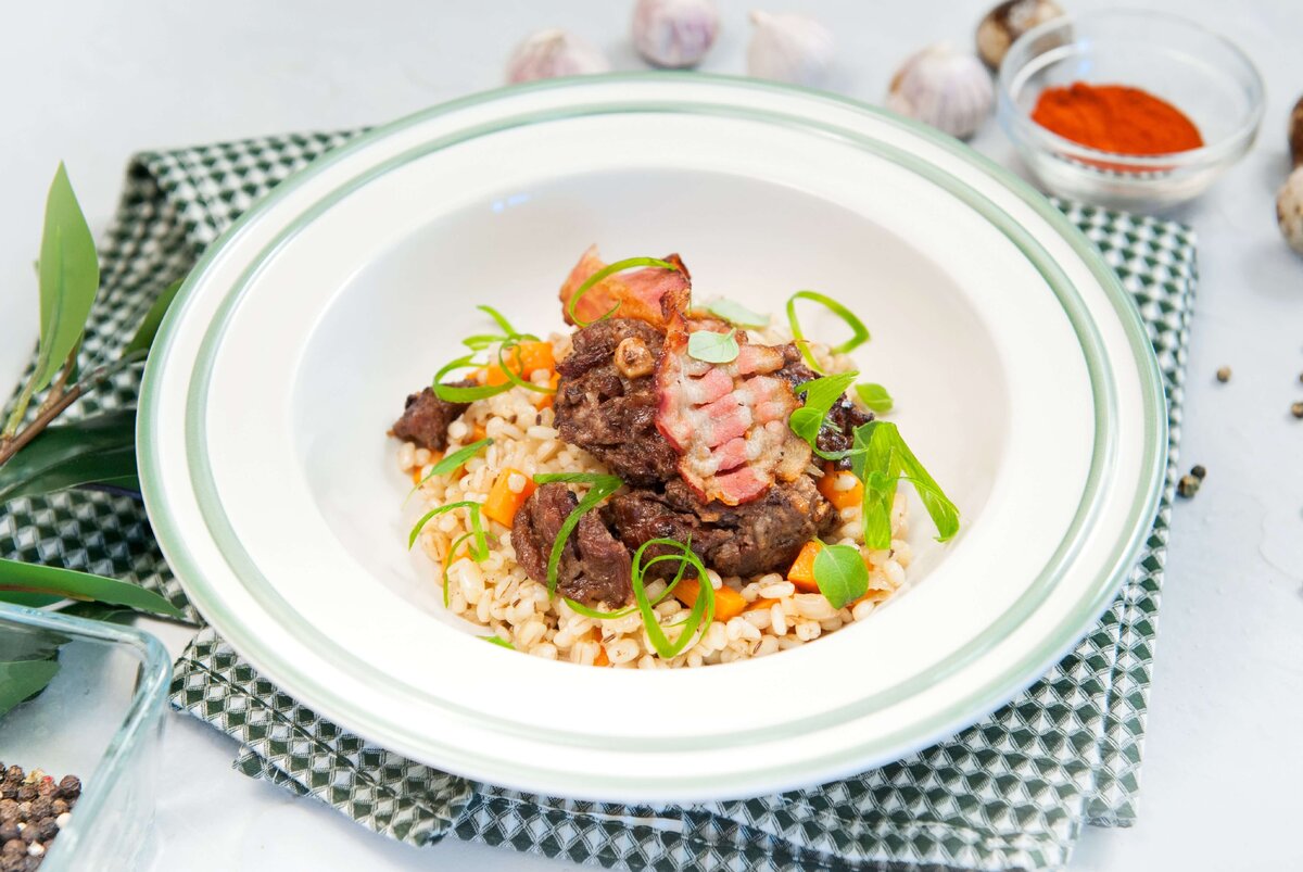 базилик Способ приготовления 1. Отвариваем перловку в подсоленной воде, по готовности сливаем. 2. Нарезаем кубиком морковь и лук. 3. Нарезаем тонкой соломкой зелёный лук, отправляем в ледяную воду. 4. Обжариваем бекон на растительном масле, перчим и обсушиваем на салфетке. 5. В сковороду, к жиру от бекона, добавляем льняное масло и обжариваем лук и морковь. Добавляем зиру и чеснок. 6. Часть обжаренного лука перекладываем на другую сковородку, добавляем к нему тушёнку, обжариваем. 7. Часть сока от тушёнки добавляем к луку и моркови, прогреваем, добавляем подваренную перловку, прогреваем 3-5 минут, солим и перчим. 8. Выкладываем перловку в глубокую тарелку, сверху добавляем тушёную говядину. Украшаем обжаренным беконом, листиками базилика и зелёным луком. Приятного аппетита! Еще больше рецептов на сайте tveda.ru Любите читать Дзен Телеканала «Еда»? Расскажите свое мнение о материале в комментариях и ставьте лайки