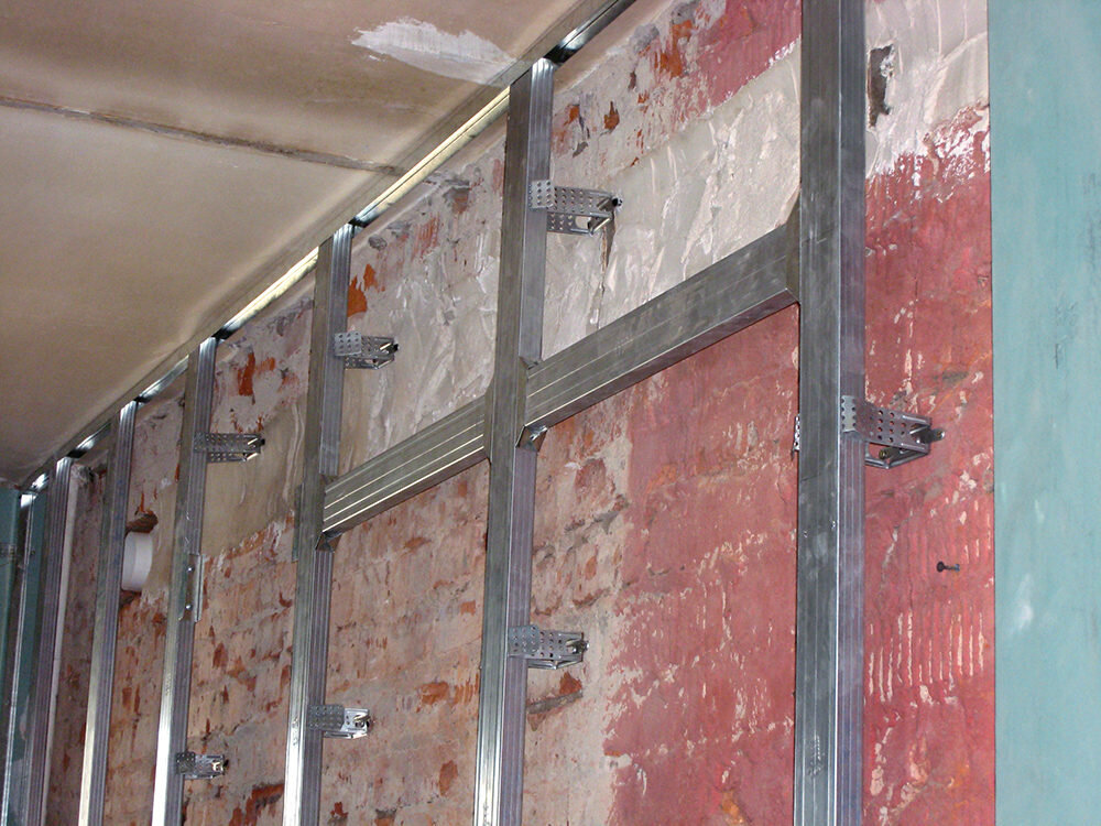 Более комфортным и несложным методом считается выравнивание стен гипсокартонном. Обычные размеры данного материала 1200х2500 мм или 1200х3000 мм . Для начала необходимо отметить все точки для монтажа несущих профилей. Крепить профиля необходимо вертикально и параллельно друг другу. Здесь вам может помочь отвес или уровень, нанесите по уровню риски через 50-60 сантим. Данную операцию нужно сделать для всех профилей. При этом нужно иметь в виду, что некоторые профиля будут считаться местом стыковки для двух располагающихся рядом листов гипсокартона, и при разметке это предусматривается. После этого, в местах разметки монтируются крепления, - это подвесы профиля (скобы), которые монтируются к стене дупель шурупами 6х После завершения работ по монтажу каркаса, приступаем к монтажу коммуникаций, которые проходят в стене. Их необходимо скрыть в каркас, а свободные полости необходимо заполнить изоляционными материалами. Обшивать каркас гипсокартонном начинают с любого верхнего угла. Имейт