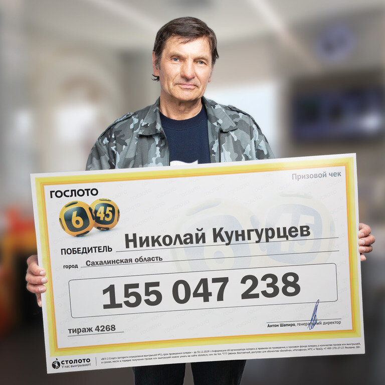 Победитель, который в 4268-м тираже «Гослото «6 из 45» выиграл 155 047 238 рублей, нашелся спустя месяц. Мультимиллионером стал пенсионер из Сахалинской области Николай Кунгурцев. Мужчина знаком с лотереями с советских времен. Хотя Николай всегда верил в крупную удачу, настолько многомиллионный выигрыш его шокировал. — Я неделю приходил в себя, никак не мог поверить, что мне повезло. Потом уже позвонил в контактный центр «Столото», где мне подтвердили выигрыш и пригласили в Москву, — рассказал победитель. Тираж государственной лотереи, в котором повезло Николаю Александровичу, должен был стать распределительным. Если бы никто из участников не отгадал все 6 чисел, то сумма накопленного суперприза разделилась бы между всеми победителями. — В этот день я был на баскетбольном матче, где моя любимая команда «Восток-65» выиграла! А еще наши хоккеисты стали чемпионами Азиатской хоккейной лиги. Подумал, что мне тоже должна улыбнуться удача, и купил 5 билетов. Рассчитывал угадать три числа,
