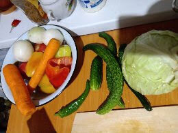 Зимой самый вкусный салат такой свежий уходит очень быстро и готовить легко. А если у вас есть кухонный комбайн в разы быстрей. Подавать с мясом или с картошкой очень вкусно. Овощи остаются хрумкими и свежими. Мы всегда ставим на стол на любые праздники по водочку самое то. Так же на работу можно положить в контейнер на перекус. В общем ловите рецепт. Нам потребуется: Способ приготовления: Все овощи моем и чистим отрезая плодоножки и все лишнее. Капусту шинкуем, морковь на крупной терке трем. Сладкий перец режем соломкой, помидоры часть кусочками, а вторую часть протереть. Все складываем в большую кастрюлю перемешиваем и добавляем соль, сахар и растительное масло. Нужно поставить на огонь и как только закипит, кипятим 10 минут не более. Добавляем уксус все хорошо перемешиваем и раскладываем в стерилизованные банки и быстро закручиваем. Банки оставляем при комнатной температуре остывать. Все наш салат готов. Очень вкусная закуска на любое застолье. Всем приятного аппетита. Желаю вам