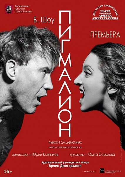 В Московском Драматическом Театре под руководством Армена Джигарханяна Новая сценическая версия спектакля «Пигмалион» Классическое прочтение пьесы Бернарда Шоу, за которое я очень благодарна театру. Открытый финал и раньше будоражил воображение, а в современных реалиях оставляет ещё больше простора для фантазий. Но вернёмся к началу. Блеск и нищета английского общества начала 20-го века. Во всей своей красе. Режиссеру Юрию Клепикову удалось найти идеальный рецепт, благодаря которому каждый из героев ярок, интересен и реалистичен, какой бы из слоёв общества он не представлял. Запомнились даже второстепенные герои, такие как Фрэди (Михаил Железнов) или слуга миссис Хигинс (Алексей Лапшин). Поверьте мне на слово, отлично играют абсолютно все! Но я, пожалуй, остановлюсь на тех актёрах, а точнее, парах, которые не просто отличны, а великолепны! Трудно подобрать более непохожих и одновременно так подходящих друг другу людей. Надежда Селиванова явила нам изумительную Элизу. Искреннюю, раним