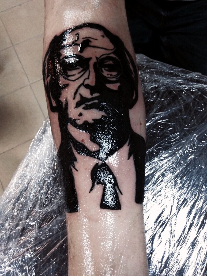 Эскиз был выбран очень быстро, так как я знал чего хочу. Это Иосиф Александрович Бродский - один из моих любимых поэтов. Далее, мастер, учтя все мои пожелания, добавил ветку с вороном на лоб писателя и мы приступили.