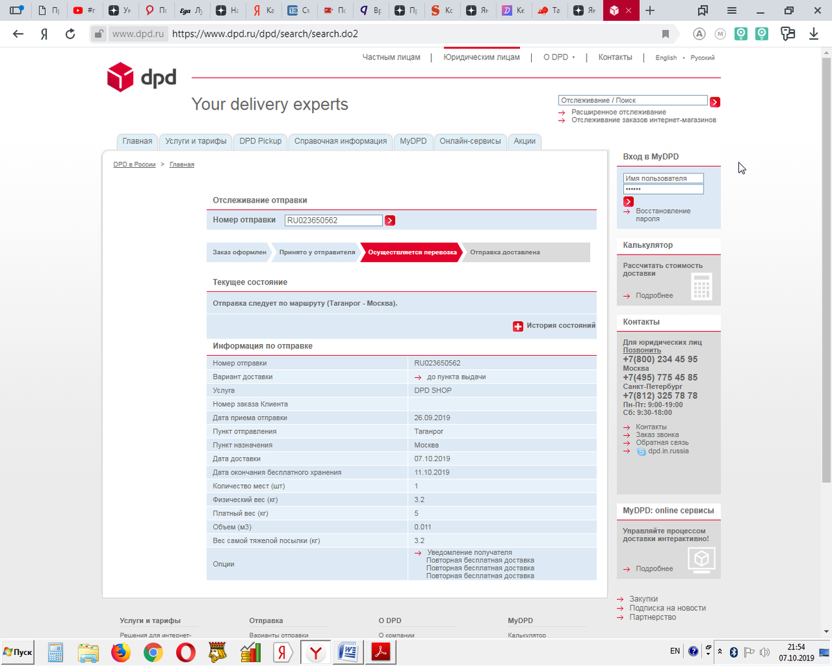 Здравствуйте, уважаемые читатели! Начало этой истории смотрите здесь. 07.10.019 посылка вновь доставлена не была. 08.10.19 звоню в DPD. Диалог: Я - Скажите, почему не доставлена моя посылка? О (оператор, кажется, была Ольга) – Экспедитор не успел. Мой истерический смех (про себя) Я - И сколько это будет продолжаться? О - А Вы не могли бы приехать к нам на Волгоградский проспект? Я - Нет! О - Я напишу в логистику письмо и возьму на контроль. Я - Уже сколько писем написано! О - Даже не знаю, что предпринять. Я - Сегодня доставите? О - Доставки Вашей посылки на сегодня нет! Я - Почему? О - Не знаю. Я - Давайте сделаем так. Ваша контора берет отдельно взятого экспедитора, и за свой счет доставляет посылку до двери. О - Минуту. (Совещается). Да так можно. Диктуйте адрес. Я - Диктую адрес. Когда доставите? О - Один-два дня. Я - Хорошо. В среду получаю sms: Дмитрий Юрьевич,добрый день.Пожалуйста,дождитесь смс и получите RU023650562 по адресу Москва, б-р Измайловский, дом 43, офис 220. Звон