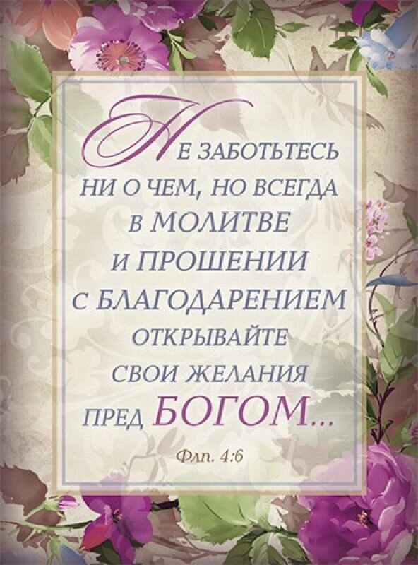 "Не заботьтесь ни о чем , но всегда в молитве и прошении с благодарением открывайте свои желания пред Богом, - и мир Божий, который превыше всякого ума, соблюдет сердца ваши и помышления ваши во Христе Иисусе" (Филип.4:6). Верующий не должен жить в постоянных заботах. Серьезными и многочисленными могут быть наши испытания, трудности и огорчения, но ни при каких условиях мы не должны тревожиться, ведь наш всемогущий Небесный Отец любит Своих детей так же сильно, как Своего Единородного Сына. Он всегда рад помочь и поддержать их при любых обстоятельствах. Будем помнить слова: "Не заботьтесь ни о чем, но всегда в молитве и прошении с благодарением открывайте свои желания пред Богом" (Филип.4:6). "Всегда" - значит не только тогда, когда наш дом в огне, или когда жена и дети при смерти, но и в повседневных жизненных мелочах, которые мы называем пустяками. "Всегда" - значит жить постоянно в святом общении с Отцом Небесным и Господом Иисусом Христом. Даже пробуждаясь ночью по зову сердца, мы