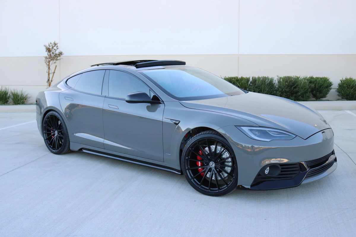 На автомобиль установлены большие колеса, диаметром двадцать один дюйм. Черный цвет кузова, черный салон и продвинутая версия автопилота.