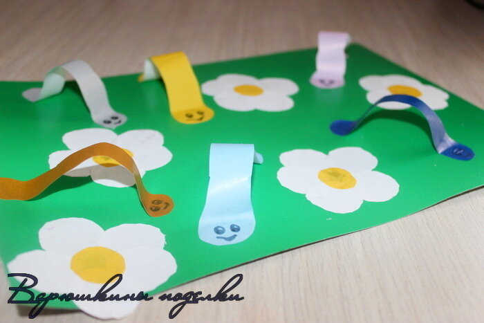 Не знаете, чем занять малыша 2-3 лет? Попробуйте сделать с ним эту простую, но интересную аппликацию с объемными червячками. Ребенку точно понравится приклеивать детали на картинку и любоваться полученным результатом! Изготовление такой поделки тренирует воображение ребенка, ведь именно ему придется размещать элементы на картинку. Также малыш может добавить в композицию что-то свое. Например обвести цветы, прорисовать травинки, изобразить тропы, по которым ползут червячки. Также тренируется мелкая моторика ребенка. Ведь склеивание аппликации - дело хоть и интересное, но достаточно трудоемкое для детских пальчиков! Главное, подготовить все фрагменты для аппликации заранее. Взрослому потребуется вырезать кружочки для цветов желтого и белого цветов, а также разноцветных червячков. Ну, а приклеивание стоит доверить своим маленьким ассистентам:) Нам потребуется: Для начала подготовим небольшие кружочки белого и желтого цветов. На каждый желтый должно приходиться 5 белых! Теперь берем цветну