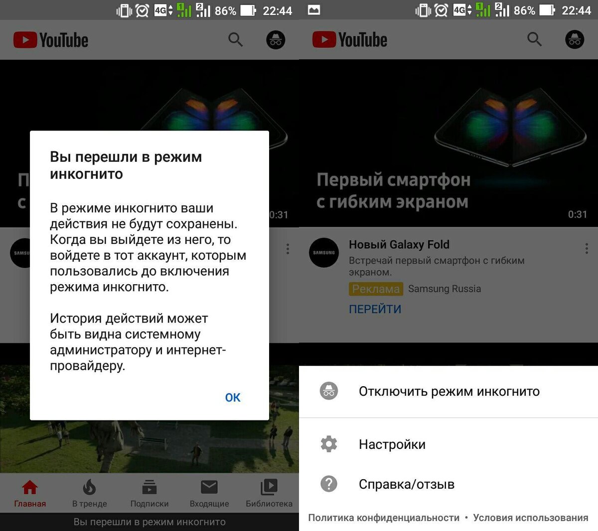 Инкогнито позволяет как убрать видео из истории просмотров, так и исключить его влияние на рекомендации сервиса. Чтобы активировать: 1. Откройте приложение YouTube. 2. Нажмите на иконку аккаунта. 3. Выберите пункт "Включить режим инкогнито". Режим будет отображаться в виде зеленой плашки с надписью "Вы перешли в режим инкогнито" снизу окна приложения. Чтобы отключить инкогнито, нажмите на иконку аккаунта и выберите пункт "Отключить режим инкогнито".