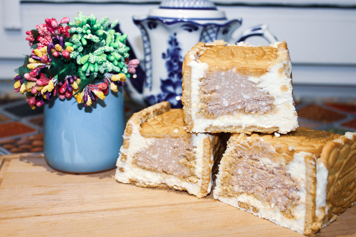 Необычная подача всеми известных продуктов. Ингредиенты: Творог - 500 г Печенье - 500 г Масло сливочное - 100 г Какао - 2 ст.л. Сахар - 100 г Приготовление: 1. Творог, сахар и мягкое сливочное масло взбить блендером до однородности. Разделить тесто на 2 равные части, в одну добавить какао и хорошо перемешать. 2. На фольгу выложить печенье в три ряда. Распределить белую творожную массу по печенью. 3. Часть печенья растереть в крошку и высыпать сверху на творожную массу. Сверху выложить творожную массу с какао. 4. При помощи фольги поднять края печенья, формируя бортики. Закрыть верх оставшимся печеньем. 5. Свернуть плотный брусок и поставить в холодильник на 3-4 часа.