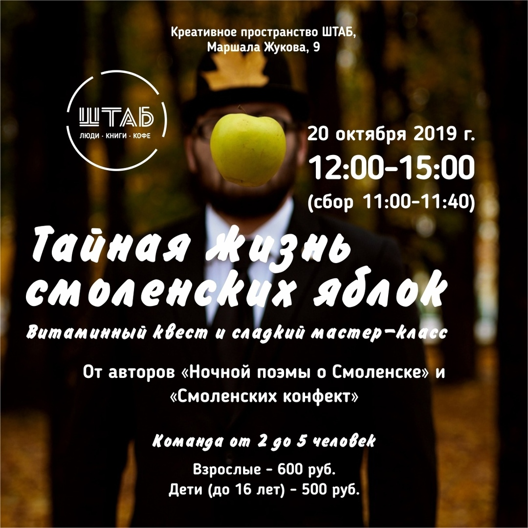 Витаминный квест и сладкий мастер-класс В воскресенье, 20 октября «Экскурсионное бюро Ефимкиных», «Смоленские конфекты» и «Штаб» приглашают принять участие в яблочных приключениях и совершить витаминный квест. Что вы будете делать, и как проходить витаминный квест? · решать исторические загадки, · искать кулинарные подсказки, · заниматься фотоохотой на яблоки, · готовить смоленские конфеКты в мятном сахаре, · пить чай с конфеКтами, · весело проводить время в хорошей компании. Победитель квеста получит большой вкусный набор смоленских конфеКт от производителя. Но попробовать их и принять участие в приготовлении смогут все. Что такое смоленские конфеКты? Это наша с вами история – забытая смоленская слать, которую ящиками заказывала себе Екатерина II. Забытый на сто лет рецепт удалось восстановить стараниями энтузиастов. На решение заданий отведено 2 часа – с 12:00 до 14:00. В14.00 в «Штабе» пройдет награждение победителя, а затем – масте