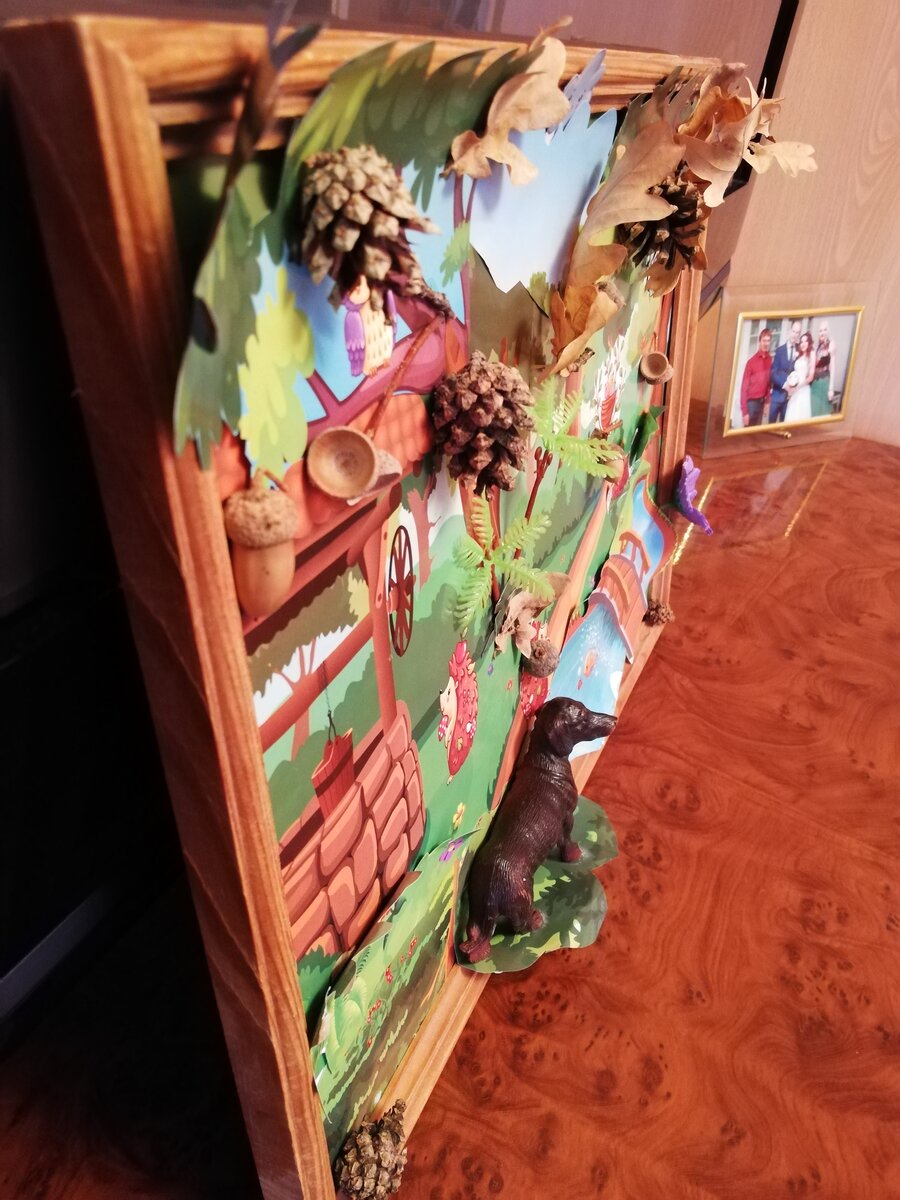 Папы и мамы деток, которые ходят в детские сады, начальные школы и всевозможные развивающие кружки часто мастерят со своими детишками разные тематические поделки. Мы тоже мастерим все подряд своими руками. Картина «Осенний пейзаж». 1. Взяли старую деревянную рамку из под фото, без стекла (оно и не понадобится) и нашли подходящую бумажную картинку из детских книжек. Таких книжек в каждой семье просто пруд пруди. Тема картины может быть разной – весна, зима, моря, машины, роботы. Трактора, куклы, животные и т.д. 2. Картинку подогнали под размер нашей рамки путем отрезания ножницами лишнего с боков и подклеивания полосок недостающего размера по верху и по низу картины для симметрии. Задача. Лишь бы был зеленый фон для творчества. Все. Платформа готова. Можно фантазировать. 3. Важно. Сама картинка из журнала очень тонкая. Для несущей способности полотна, с обратной стороны картины наклеили несколько слоев (2-4) из разных журнальных листов. Это для того, что бы полотно получилось