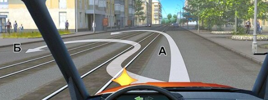Всех приветствуем на нашем канале Мастер ПДД. Давайте с Вами разберем вопрос, который входит в экзаменационный билет. Вопрос не отличается сложностью, но все равно многие совершают ошибку в нем. По какой траектории можно выполнить разворот? 1. Только по траектории А. 2. Только по траектории Б. 3. По любой траектории из указанных. В данном вопросе нам предлагают выбрать траекторию для разворота, которая соответствует правилам дорожного движения. Одна траектория проходит через трамвайные пути, другая нет. Для правильного ответа надо опираться на пункт правил 8.5 8.5. Перед поворотом направо, налево или разворотом водитель обязан заблаговременно занять соответствующее крайнее положение на проезжей части, предназначенной для движения в данном направлении, кроме случаев, когда совершается поворот при въезде на перекресток, где организовано круговое движение. При наличии слева трамвайных путей попутного направления, расположенных на одном уровне с проезжей частью, поворот нал