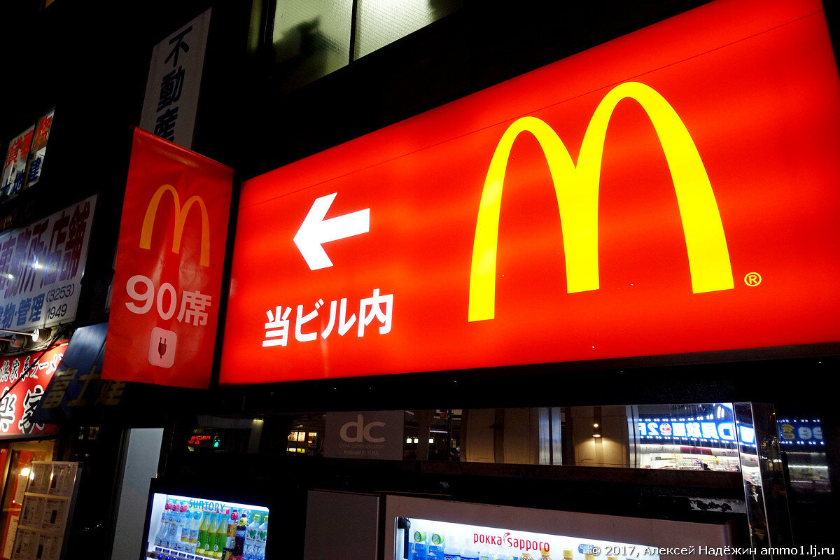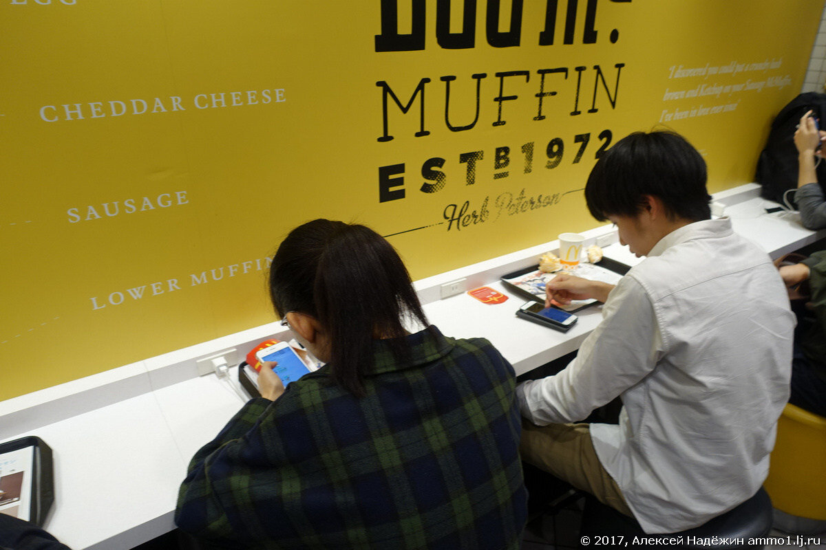 У нас многие в шутку называют Макдональдс сетью бесплатных туалетов. В Японии Макдональдс - это сеть бесплатных интернет-кафе. Обратите внимание на вывеску. Да, там нарисована электрическая вилка. Большинство столов в Японских Макдональдсах стоят у стен, чтобы люди, отгородившись спиной от всего мира, могли уткнуться в свои гаджеты, что они с удовольствием и делают. Для каждого места есть своя розетка. Работает бесплатный WIFI. И что немаловажно есть бесплатный туалет. В Макдональдсе на Гиндзе четыре больших зала для посетителей и почти все места заняты, но мало кто из сидящих там есть - люди работают или зависают в соцсетях. Рядом со мной японец средних лет правил сложнейшую схему водопроводной сети в какой-то CAD-программе на своём ноутбуке, какая уж тут еда. :) Я зашёл в Макдональдс из интереса (я всегда захожу в них по всему миру, чтобы посмотреть, что в них есть такого, чего больше нет нигде) и вдруг стал постоянным посетителем. :) Хожу туда уже третий день и обедаю вкуснейшими су