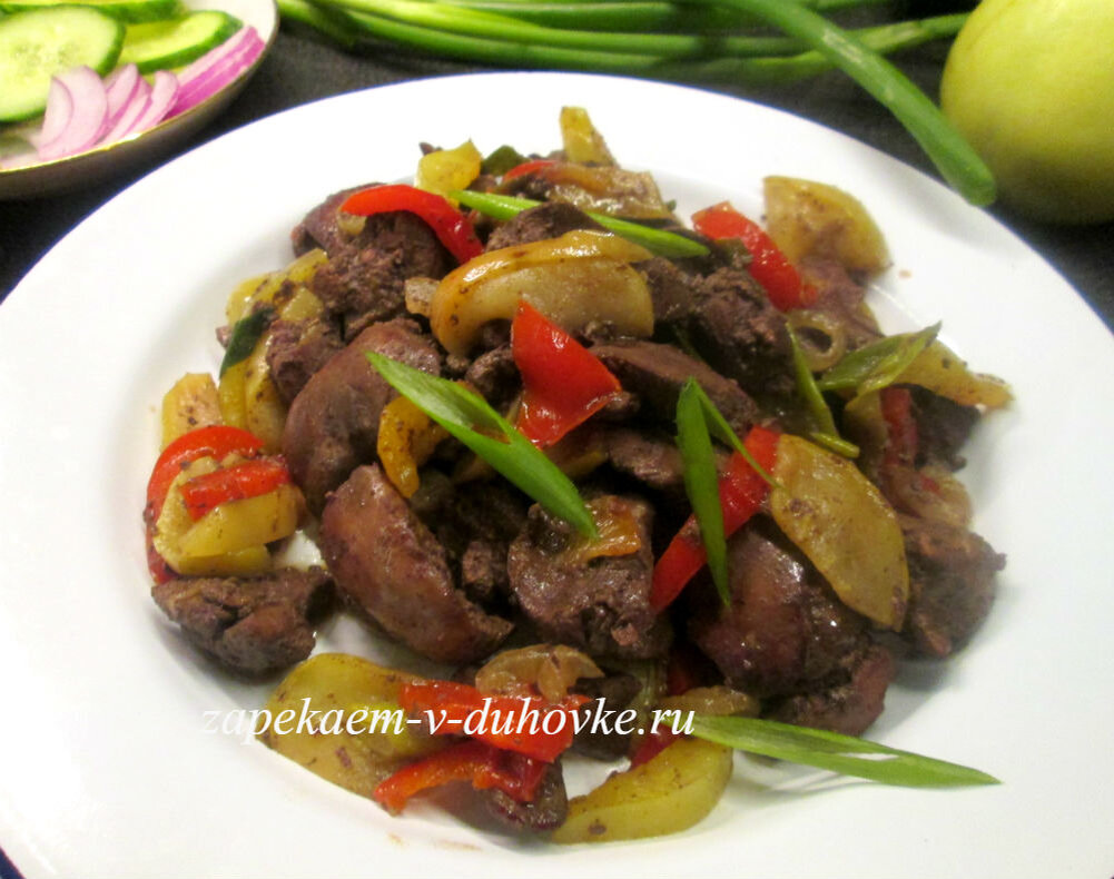 Как вкусно и по-новому начинает звучать печень в этом блюде! Печень можно использовать любую: говяжью, индюшиную, куриную. Я готовила с разной: вкусно и сочно получается с любой печенью. Овощей в этом блюде очень много и они вполне могут заменить гарнир. По желанию можно дополнительно увеличить их количество. От этого печень станет только вкуснее. Яблоки подойдут любые, но зеленые, на мой взгляд, придадут небольшую кислинку. Кроме того, по желанию, добавляем помидоры. Это еще одна дополнительная нотка во вкусе. Если у вас нет в наличии какого-либо ингредиента, можно готовить без него. Будет также вкусно. Первым делом разрезаем яблоки на две половины: вынимаем сердцевину, а после этого нарезаем дольками. Перец также освобождаем от сердцевины, семечек, перегородок. Лук очищаем, затем нарезаем кубиками или полукольцами — на свой вкус. Я режу его покрупнее. Печень нарезаем кусочками. Убираем пленки. После этого обжариваем на подсолнечном масле 4-5 минут. Затем снимаем со сковороды и