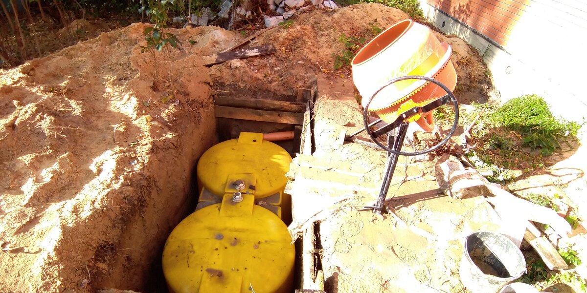 Итак земляные работы продолжаются ! Делаем дренажную емкость из подручных средств.... Получившийся из 2-х кубовых бочек красивый желтенький септик залил бетоном в 3 этапа: Первый этап - заполнил водой до уровня переливного отверстия и залил первую партию свежеприготовленного жидкого раствора . Когда бетон схватился продолжил этот процесс до уровня сливного отверстия и дал застыть . Третим этапом сформировал опалубку из двух половинок старой шины (резал болгаркой - стер до нуля 5 маленьких дисков по металлу ) и кусков фанеры ,для устройства люков . Убрал осенние листья. Для армирования перекрытия септика использовал стекло-пластиковую сетку в 2 слоя. Залил бетоном . Для изготовления дренажной системы использовал две пластиковые бочки из под средства огне-био защиты для обработки древесины. Обрезал лишнее и скрепил их родным хомутом которым крепилась крышка бочки . Насверлил отверстий для сброса очищенной воды в грунт. При желании можно увеличить количество секци