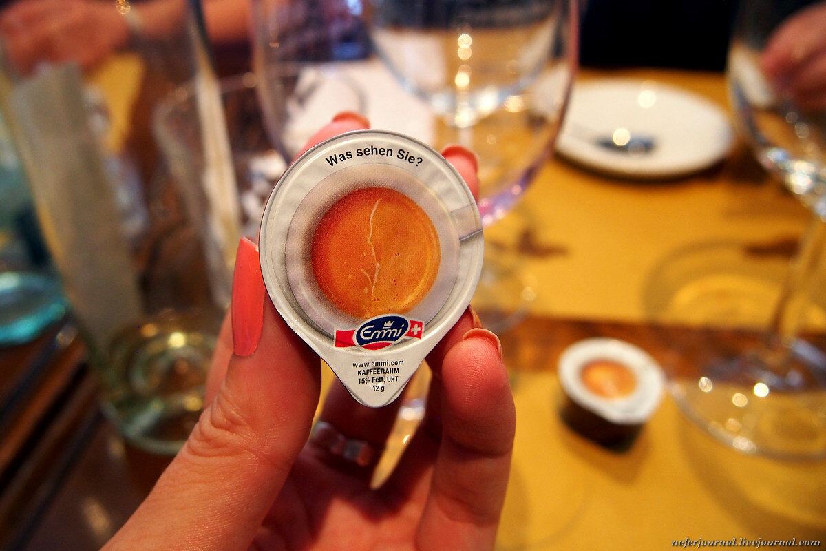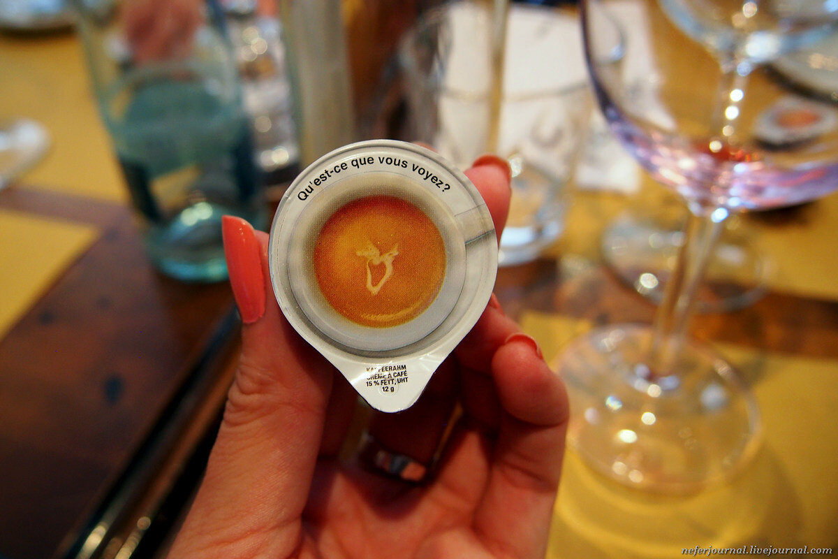 В одном из ресторанов Кран-Монтаны после обеда нам подали кофе. К каждой чашке положили сливки. Вдруг кто-то заметил, что картинки разные. Стали гадать, у кого что. Потом оказалось, что отгадка скрыта внутри упаковки. Прикольная фишка.
