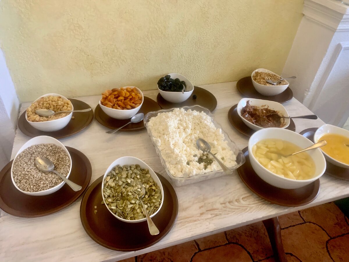 На выходных отдохнули с семьей 2 взрослых и 2 детей (7 и 10 лет) в подмосковном парк-отеле. Стоимость проживания в 2-комнатном номере за сутки составила 10 тыс.рублей (это с учетом купона, а так стоимость ). В стоимость проживания было включено 3-разовое питание. Давайте посмотрим, чем же кормят в подобных отелях. Завтрак Завтрак был достаточно стандартный, но разнообразный: каша, омлет и вареные яйца, блинчики, сосиски, творожная запеканка, картофельные крокеты, нарезки колбас и сыров, овощи. Необычным только показалось подача творога (да и не везде он в принципе бывает на завтрака) Также не совсем привычно на завтрак видеть салаты (столичный, винегрет, мясной), спагетти и отварную цветную капусту- но зато еда на любой вкус. Обед и ужин Они отличались только наличием супов. В тот день, когда были мы, предлагались на выбор: куриный (причём отдельно в пиале курица и отдельно сухарики- хочешь просто наливаешь бульон без мяса), грибной суп-пюре (очень вкусный!) и рассольник (очень г