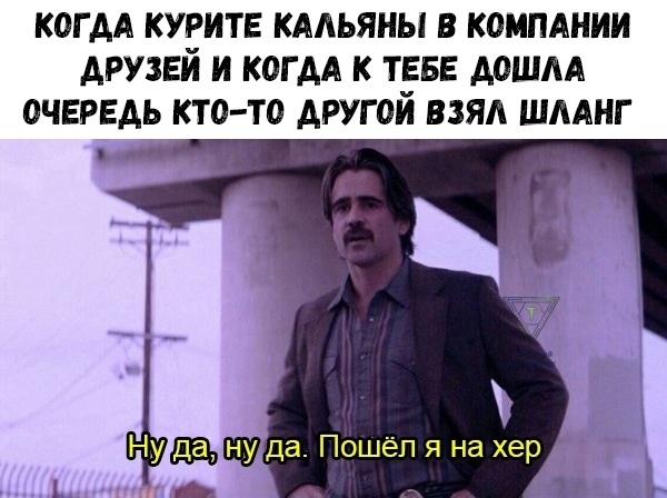 Ну да, ну да. Пошел я на хер (Ясно пошел я нахуй, Yeah fuck me) — мем с персонажем сериала «Настоящий детектив» Рэймондом Велкоро, который говорит «Ясно, пошел я на***». Происхождение Кадр и цитата, ставшие мемом, взяты из 2 сезона сериала «Настоящий детектив». В одной из сцен 2 эпизода герой Рэймонд Велкоро (Колин Фаррелл) после разговора с Френком Семьоном (Винс Вон) обращается к детям, играющим возле сточных вод. В ответ на предупреждение об опасности дети показали Рэю фак. Тогда он и произнес фразу «Ясно, пошел я нахуй» (версия в дубляже «Кубик в кубе»). В оригинале фраза звучит как Yeah, fuck me. Сезон вышел на экраны 21 июня 2015 года. И уже на следующей неделе гифка с этой сценой завирусилась в интернете. В феврале 2017 года аналогичная гифка, но с русским переводом попала на Coub и тоже стала распространяться в рунете. В качестве мема кадр из сериала стали использовать в начале 2018 года. Изначально это была простая реакция, которую прикрепляли в комментариях на «Пикабу» ил