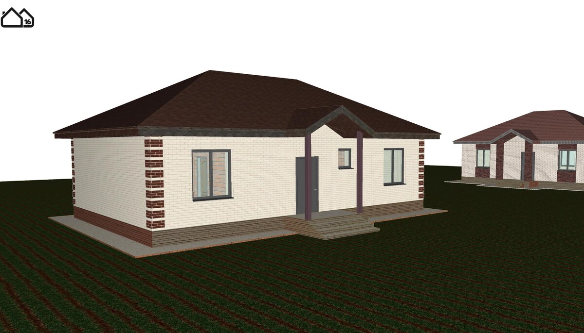 Расположение жилых комнат дает возможность свободной ориентации дома относительно сторон света, кроме того дом имеет двоякую возможность постановки относительно улицы. Планировка дома решена следующим образом - при входе в дом мы попадаем в тамбур слева от которого находятся кухонная кладовая, кухня и гостиная, справа - ванная и спальня, прямо - холл и две спальни. Из гостиной организован выход на приусадебный участок Основные архитектурно-строительные решения: