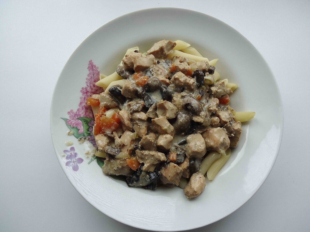 Добавляем филе, размоченные грибы вместе с настоем. Тушим 15 минут.
