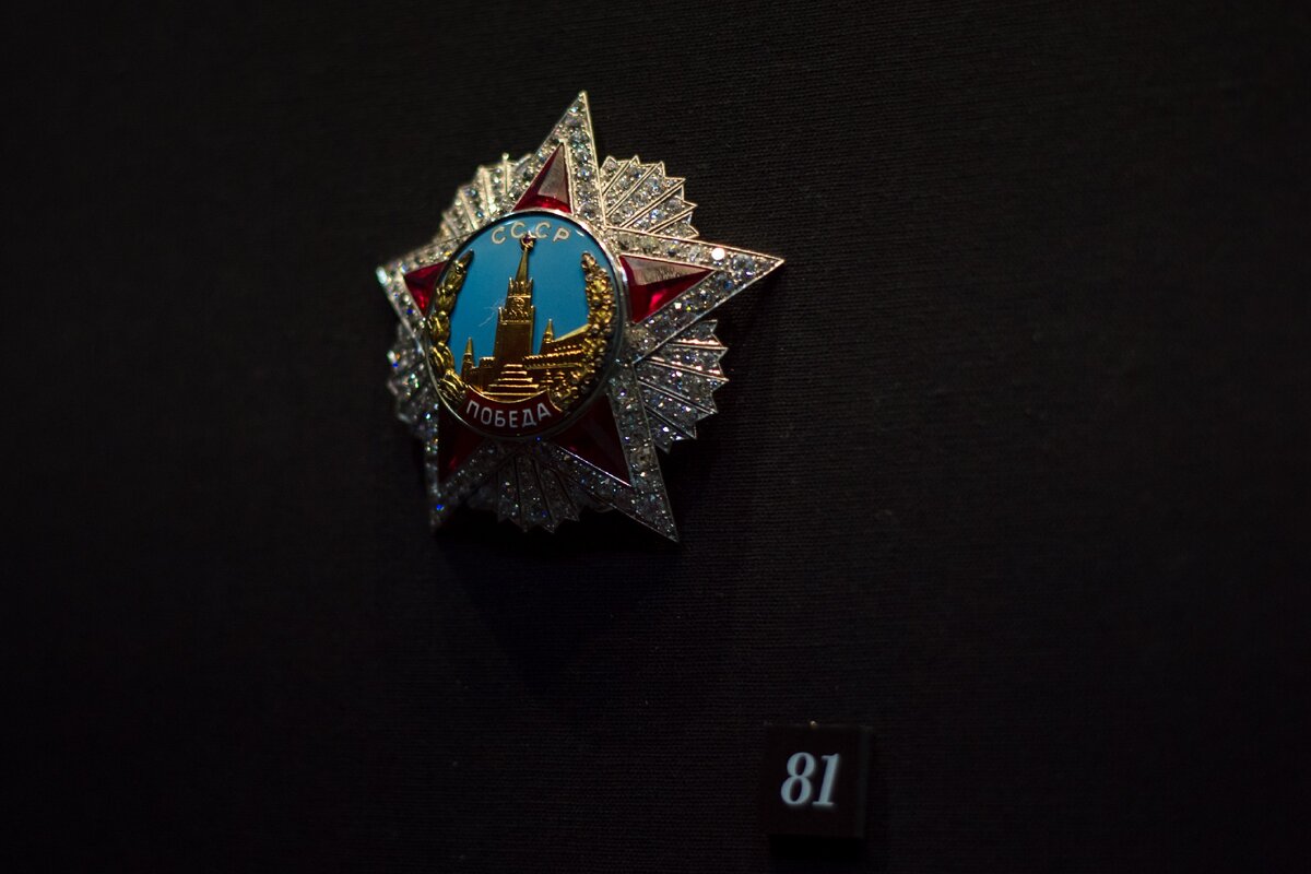 – Есть на выставке еще один орден, о котором хочется сказать особо, – говорит Елена Гагарина. – Это орден Победы. Единственная советская награда, изготовлявшаяся не на Монетном дворе, а на Московской ювелирно-часовой фабрике. При создании ордена использовались платина, золото, серебро, эмаль, пять искусственных рубинов и 174 бриллианта. Это бесценное произведение искусства, созданное советскими ювелирами и не имеющее аналогов в мире. Имена всех кавалеров ордена Победы высечены на особой памятной доске, установленной в Кремле…