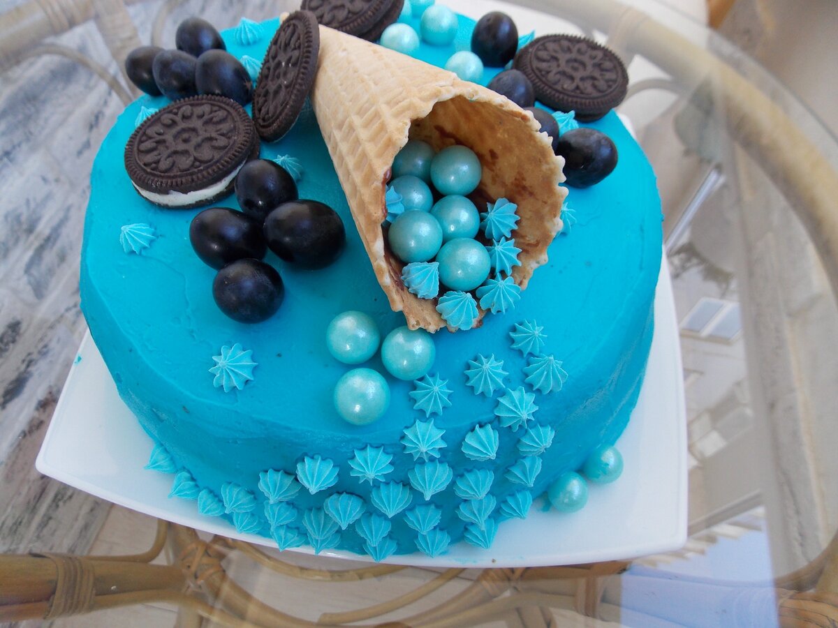 Как мужчины постоянны и однообразны :) в своих вкусах!!! На вопрос мужу:"Какой торт ты бы хотел на свой день рождения?" он ответит: "Шоколадный с вишней" На этот же вопрос сын ответил так же :) Однако, я люблю разнообразие и не люблю повторятся, поэтому на просторах инета я нашла рецепт торта, в составе которого тоже, как и в предыдущем были шоколадные коржи и использовалась вишня. Назывался он Шоколадный торт с вишневым кули и вишневым кремё. Расписывать рецепт не буду, полагаю, что по названию, вы без труда найдете подробный рецепт в интернете. Скажу только, что торт получился очень вкусный и это не только мое мнение. Было решено обрамить торт в синий цвет, но когда я его украсила как было задумано, не смотря на мальчиковый цвет, получился он больше девичий. Пришлось спасать ситуацию, добавив брутального шоколадного цвета Ну и немного красного По моему, не плохо получилось. Как вам? Радуйте себя и своих близких! Творческих вам успехов