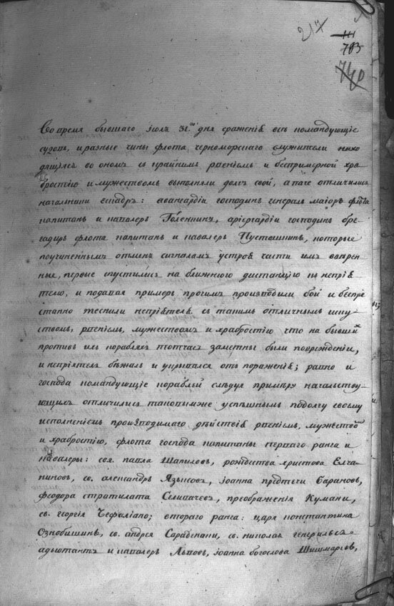 Цельный рукописный документ подписанный "Фёдор Ушаков". Самое интересное , что текст читается даже в таком качестве. Редко когда такое случается : обычно или качество пересъёмки редкостно плохое или сам текст написан так , что хочется сказать "накорябан". Особенно плохо то , что такие рукописные документы в архивах практически не выдают на руки из-за крайнего беспокойства за сохранность уникальных артефактов и исследователи вынуждены мучаться с микрофильмами едва ли не 60-х годов прошлого века. Мне довелось так "страдать" вычитывая бортовой журнал фрегата "Паллада" и я проклял всё на свете. А тут каллиграфический подчерк и очень чёткое прописание текста!