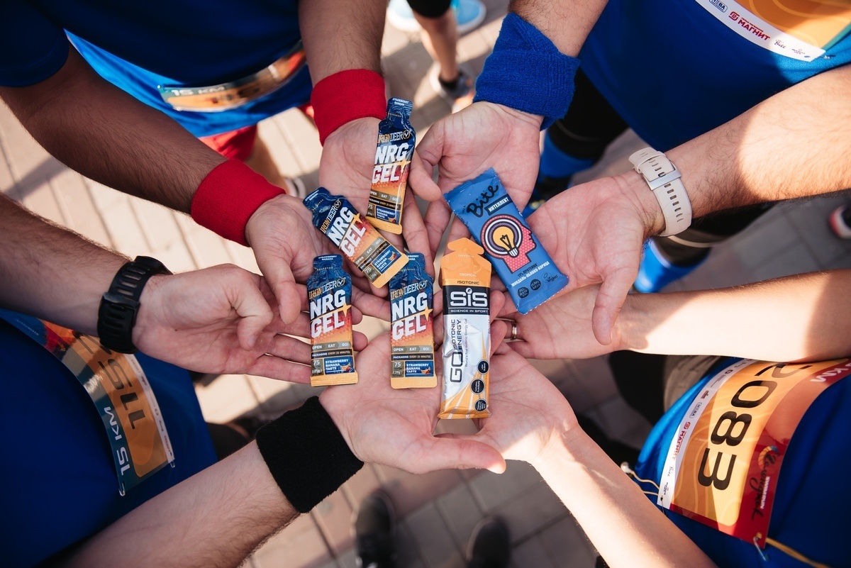 Основным источником энергии во время забега являются углеводы. При большой физической нагрузке, когда в вашем теле практически не остается углеводов, организм автоматически начинает переключаться на следующий источник энергии – жиры. Чем дольше вы можете бежать на углеводном запасе, тем лучше. Углеводы запасаются в мышцах в виде гликогена (сложный углевод). К сожалению, его запас в мышцах ограничен и организму необходимо периодически его возобновлять. Чтобы поддерживать нужный темп на протяжении всей дистанции и даже сделать финишное ускорение не забывайте об энергетических гелях. Классическая схема их приёма: первую порцию принимают через 40 минут после старта и далее по 20-25 г каждые 30 минут.