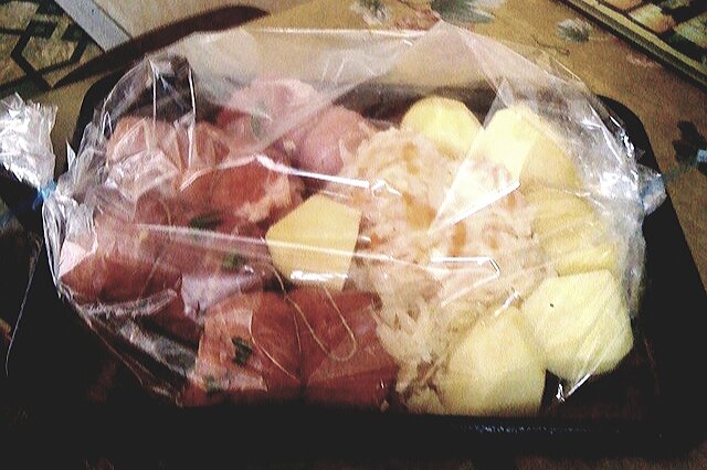 Простой,домашний,вкуснючий рецепт приготовления мяса в ИНГРЕДИЕНТЫ свинина сыр зелень чеснок картофель квашенная капуста специи кусочек сала ветчина Приготовление: Берем кусок свинины,режем на порционные кусочки для рулетов,в целофановом пакете отбиваем эти кусочки.Сыр режем на мелкие кубики,ветчину так же,чеснок и зелень то же измельчаем.Все перемешиваем. Формируем рулетики: на мясо сначала специи, потом укладываем наши измельченные индигриенты,заворачиваем рулетики, перевязываем шпагатом или скрепляем дерев. зубочистками. Картофель чистим,моем,разрезаем на несколько частей.Капусту промываем. В рукав закладываем равномерно наши продукты, в капусту я положил несколько маленьких кус.сала и семян тмина немного/на любителя/ Рукав завязываем и на противень.Потом в разогретую духовку до 200 градусов примерно на 45 - 50 минут. И будет вам вкусно!