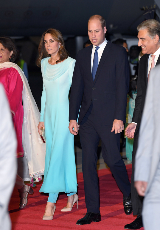 Принц Уильям и Кейт Миддлтон переняли эстафету у герцогов Сассекских, которые совсем недавно завершили свой тур по Южной Африке. Герцог и герцогиня Кембриджские начали свои тур по Пакистану. Для герцогов Кембриджских это первая поездка в Пакистан, а также первый визит представителей королевской семьи, с 2006 года после тура принца Чарльза и герцогини Корнуолльской. Для своего выхода Кейт Миддлтон выбрала традиционную одежду Азии платье с брюками под названием шальвар-камиз. Бирюзовый наряд с эффектом омбре в восточном стиле специально изготовлен британским дизайнером Кэтрин Уокер. Кейт сошла с трапа самолета в бежевых туфлях Руперта Сандерсона. Многие отметили, что этот образ очень напоминает наряд принцессы Дианы, во время ее визита в Пакистан в 1996 году. Как сообщается различными СМИ, принц Уильям и Кейт на этот раз решили оставить своих детей в Великобритании, чтобы не отрывать от занятий. По данным Кенсингтонского дворца тур предстоит насыщенным. Уже запланированы вст