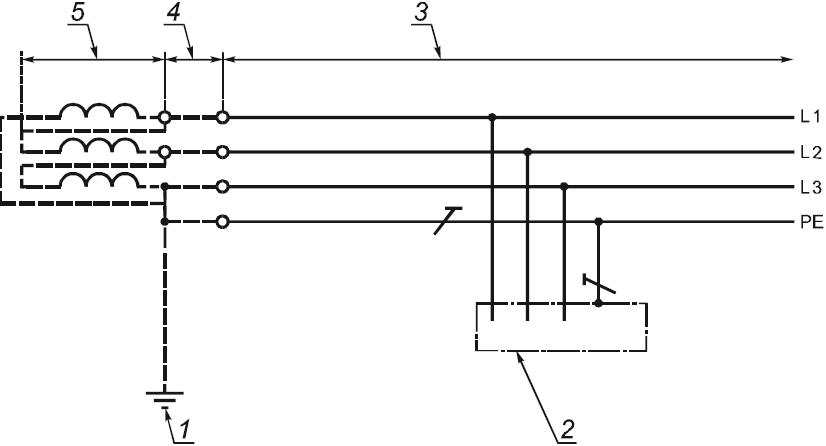 1 – заземление источника питания; 2 – открытая проводящая часть; 3 – электроустановка; 4 – распределительная электрическая сеть (при ее наличии); 5 – источник питания