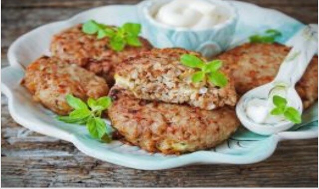 Котлеты гречневые Ингредиенты: крупа гречневая, фарш, лук репчатый, яйцо куриное, укроп, хрен сливочный, чеснок, мука пшеничная высшего сорта, соль, сахар, перец черный молотый, масло виноградной косточки, сметана, зелень. Курица с булгуром Ингредиенты: куриная грудка, булгур, лук репчатый, чеснок, масло сливочное, оливковое масло, изюм, смесь перцев, молотая паприка, соль, зелень. Пышные омлет Ингредиенты: яйцо куриное, молоко, сливки 33%, масло сливочное, зелень, соль.