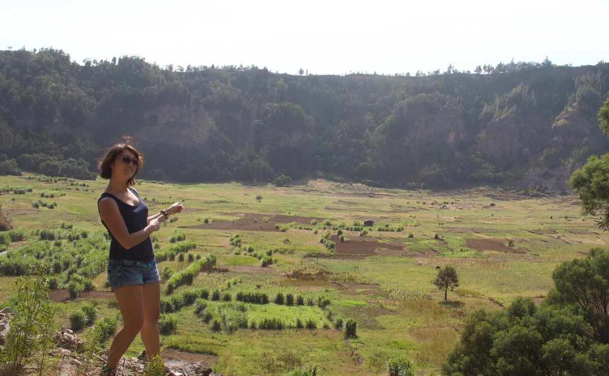 К части 1. Ну что, приготовились к продолжению нашего путешествия по Санту-Антану? Переобулись в удобную обувь, захватили бутылку холодной воды и намазались солнцезащитным кремом? Отлично, выходим из дома ловить маршрутку – сначала мы доедем до нужного района Cova, а затем отправимся в пеший спуск по горам. Cova переводится с португальского как «яма» - это кратер давно потухшего вулкана, где сейчас раскинулась зеленая долина и который местные земледельцы используют для ведения хозяйства. Вообще на острове много плантаций, которые находятся в очень удаленных от жилых домов местах – люди используют пригодные для земледелия участки в горах, каждый день проходя по несколько километров пешком. Сначала мы поднимаемся на верхний край этой "ямы", чтобы затем спуститься вниз по горам в жилую долину Paul. Вот так выглядит горная тропа: для нас этот спуск - развлечение выходного дня, а для местных земледельцев ежедневная трудовая реальность. Через некоторое время встречаем одного из местных тр