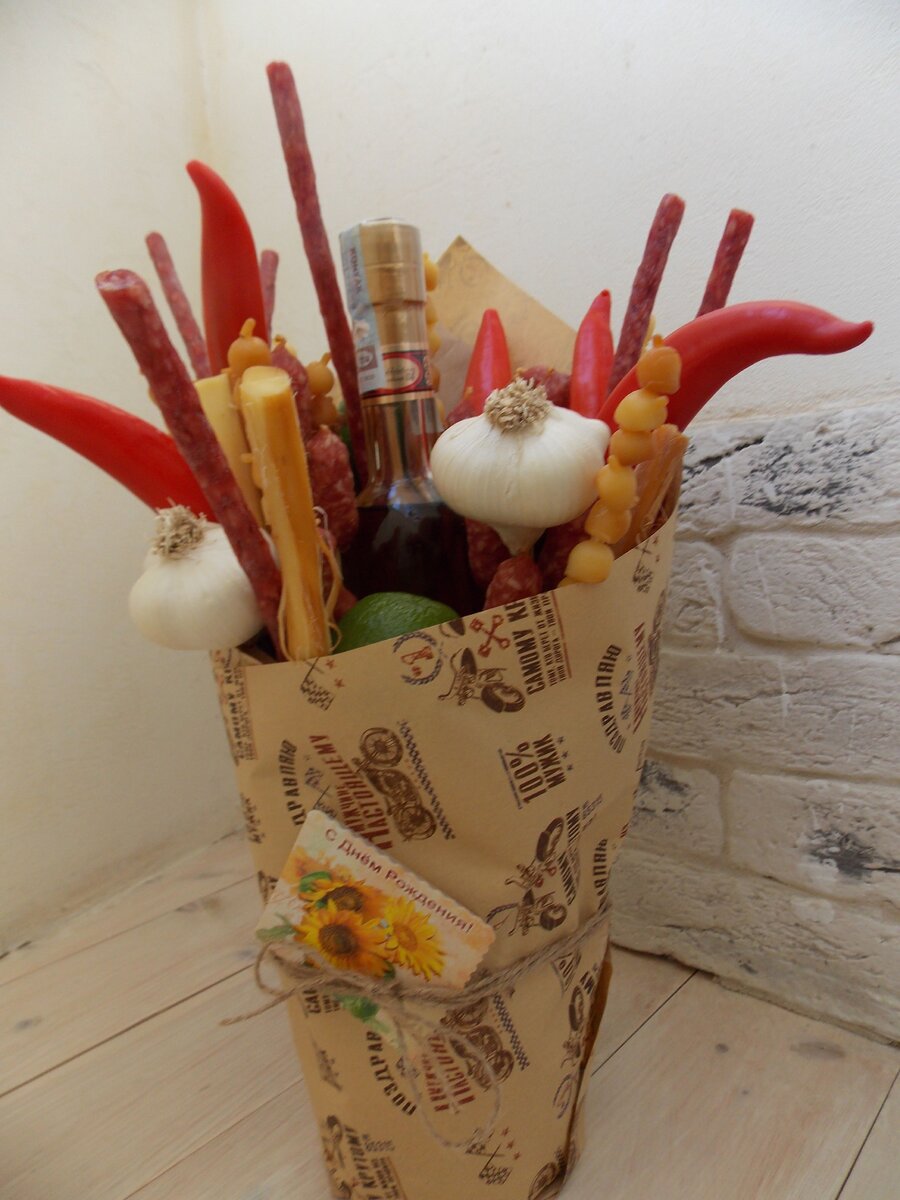 Вы собрались на день рождения мужчины и не знаете что ему подарить? Предлагаю сделать вот такой букет Вообще, фантазии здесь вашей не может быть пределов, а мое произведение можно взять за основу как вдохновение. Поделюсь некоторыми секретами создания. Чтобы не заморачиваться имениннику, куда поставить букет, я решила сразу создать его устойчивым. Для этого я приобрела пластиковое кашпо, по центру установила бутылку (в данном случае это коньяк), далее на дно следует уложить кусочки пенопласта или флористической губки (у кого что имеется). Готовим продукты:овощи и фрукты нужно тщательно помыть и обсушить. Далее работаем в перчатках: нанизываем на деревянные шпажки сыр, колбаски, чеснок, перец, лаймы, а затем создаем композицию в виде букета, укрепляя шпажки в пенопласте. Заворачиваем композицию в крафт бумагу. Готово! Можно и на день рождения идти. Творческих вам успехов и радости вашим близким