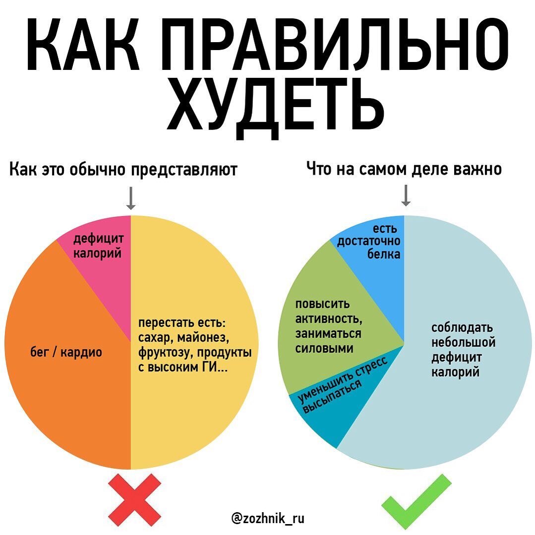 Итак, вы приняли решение похудеть. Большинство людей начинают ставить жесткие ограничения в еде и заставляют себя тренироваться. Так делать не стоит. В процессе похудения самое важное – ваш ежедневный комфорт, так как это подход к жизни и питанию, начав придерживаться которого, вы неизбежно изменитесь. На второй схеме мы наглядно показали важные принципы похудения. 👉Подписывайтесь на Инстаграм Зожника: лучшие статьи в удобном формате @zozhnik_ru Занимайтесь тем видом активности, который вам действительно нравится и который вы не бросите, своевременно отдыхайте и высыпайтесь получайте удовольствие от жизни и у вас не будет лишних килограммов.