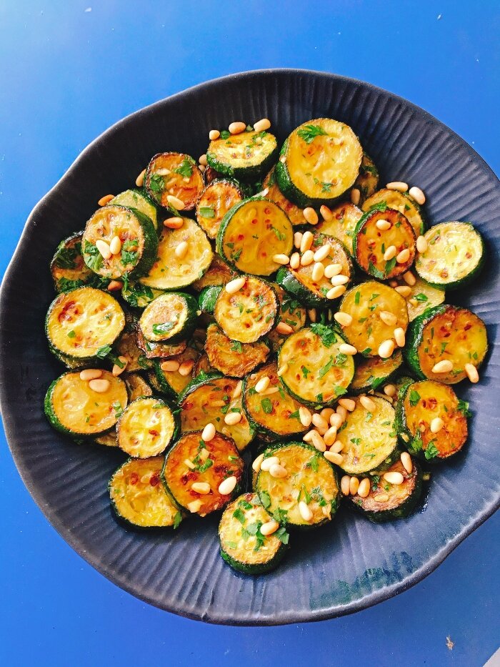 Салат из цукини на гриле с кедровыми орешками, чесноком и петрушкой
