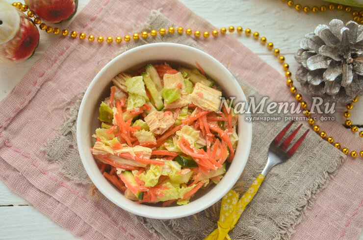 - соевая спаржа - 100 г. Огурец помойте, обрежьте кончики. Нарежьте тонкой соломкой или кубиками, сложите в салатник Используйте мягкую часть листа пекинской капусты, а не центральную жесткую. Нарежьте листья тонкими полосками, переложите в салатник (можно заменить листьями салата) Спаржу также переложите в салатник, предварительно разрезав более длинные кусочки на более короткие Отправьте в салатник морковь по-корейски, предварительно отжав ее от излишков маринад Заправьте салат соевым соусом с классическим вкусом или с добавками. По желанию можно добавить еще специи, свежую рубленую зелень, чеснок (измельченный) Перед подачей можно присыпать зернами льна или кунжута https://namenu.ru/11313/Salat_iz_sparzhi_s_morkovqyu_po-korejski/