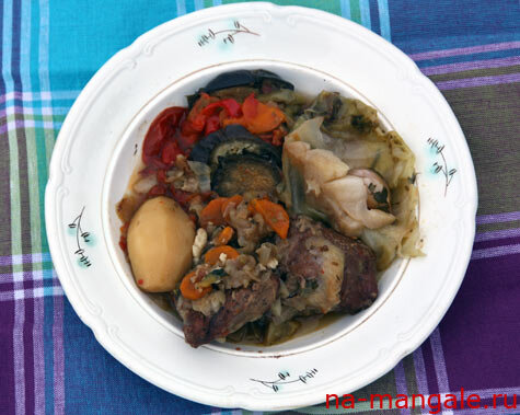 Ингредиенты на 12-литровый казан: Говядина — 1 кг; Курдюк — 150 г; Лук репчатый — 1 кг; Морковь — 3 штуки; Болгарский перец — 2-3 штуки; Баклажаны — 2-3 штуки; Спелые сочные помидоры — 4 штуки; Капуста — небольшой качан; Картофель средний — 7