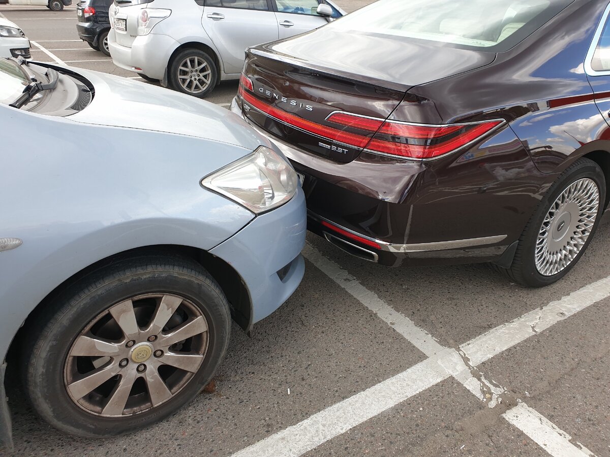 Вернувшись из магазина, я обнаружил старую Toyota Auris, "припаркованную" в задний бампер Genesis G90, на котором я приехал. Водителя Auris на месте не было. У меня возникло подозрение, что это "автоподстава". Я действовал готовясь к худшему и согласовывал свои шаги с автоюристом. Водитель Auris не мог не заметить, что въехал в Genesis. В таких случаях не уходят в магазин и либо ждут владельца второй машины, либо уезжают. По закону, за ДТП без пострадавших положен штраф, а за оставление места ДТП – арест или лишение прав. Поэтому уезжать, даже если не виноват, ни в коем случае нельзя. Я сразу вызвал ГИБДД. Как видно на фото, G90 не помещается на размеченном парковочном месте, и меня вполне можно было бы обвинить в том, что это я въехал в Auris. Поэтому необходимо было восстанавливать хронологию событий. Что подозрительного было в произошедшем? Множество вещей. Во-первых, мошенники часто "работают" на парковках крупных магазинов. Во-вторых, все произошло "на ровном месте", парковка