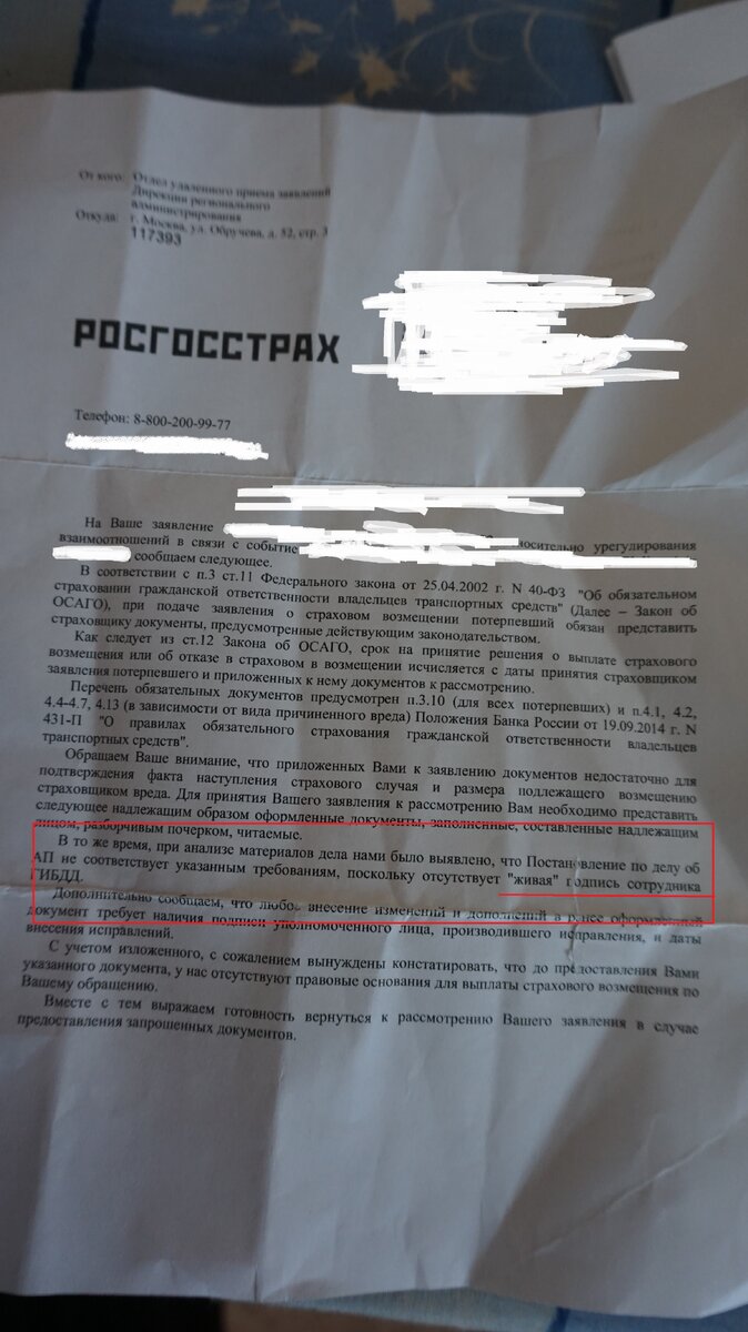 Каждый кто хоть раз попадал в ДТП в статусе пострадавшего, даже без значительных последствий, знает, что по ОСАГО становится "без вины виноватым" и жертвой страховой компании, причем своей, поскольку при наличии только двух участников ДТП обращается потерпевший в свою страховую компанию. У меня - это Росгосстрах (больше такой ошибки не совершу). Это, с позволения сказать, крупнейшая и надежнейшая (по их собственному мнению, расходящемуся с мнением потребителей) страховая компания начинает издеваться над своим клиентом с самого начала обращения. После того, как были поданы документы с соблюдением всех сроков, пришел отказ в страховом возмещении. Причина - отсутствие "живой" подписи сотрудника ГИБДД в постановлении. Как это выглядело в ответе компании на фото ниже. Мои попытки найти в нормативных актах хоть какое-то упоминание о том, что такой "живая" подпись и чем она отличается от "неживой" подписи сотрудника ГИБДД не увенчались успехом. Уникальная "прямая телефонная линия" Росгосстрах
