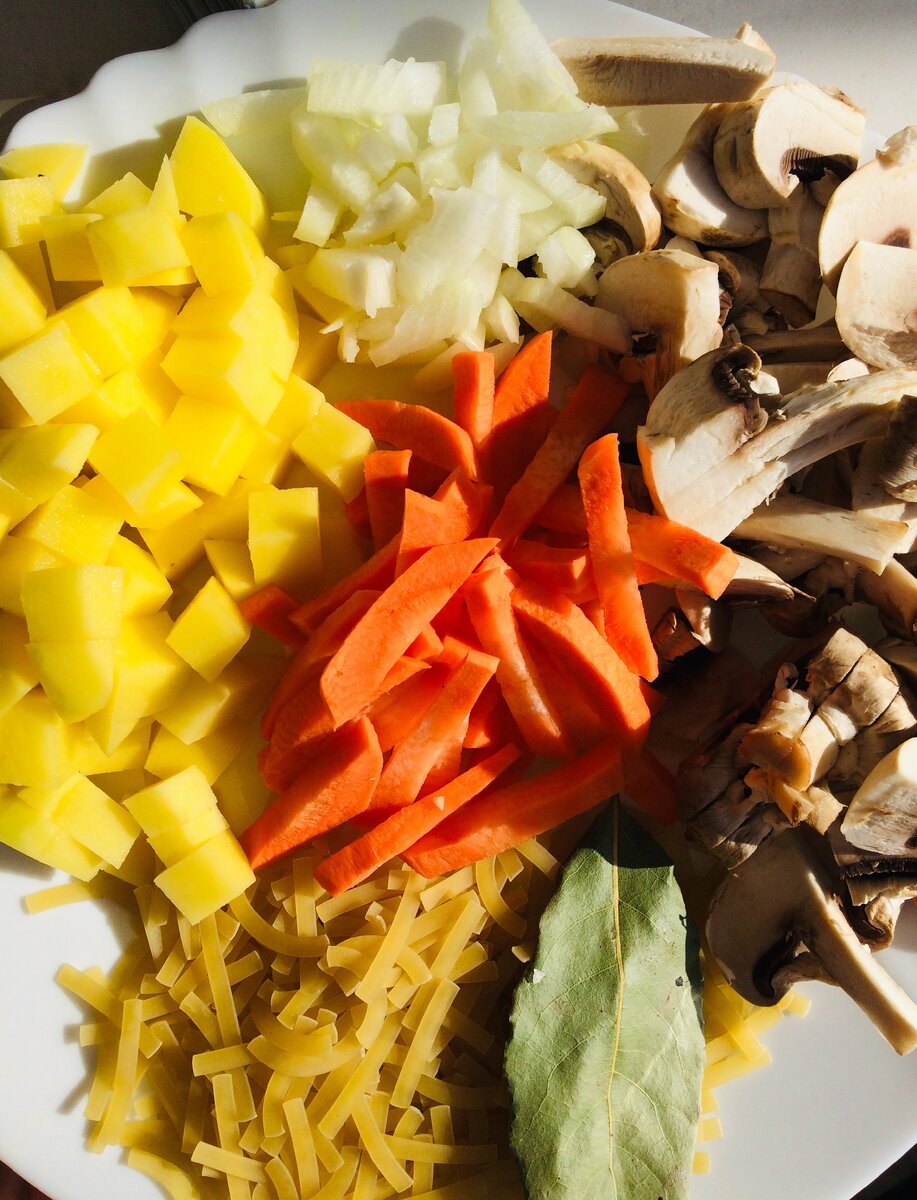 Предлагаю вашему внимаю легкий, быстрый в приготовлении, уютный и ароматный грибной супчик. Мне больше нравится вариант постной версии, а именно без добавления мяса. (При желании вы конечно можете его добавить). Вегетарианская версия мне запала в душу еще с детства. Приедешь с леса, а родители как наварят такого супа. Дымящаяся тарелка густого грибного супа - ммм. Когда совсем нет времени, а что то быстрое нужно приготовить, я делаю супчик с грибами. Грибы можно брать любые, свежие, мороженные. Я предпочитаю свежие шампиньоны. После похода в лес мы сушим белые грибы. Но они почему то быстро "улетучиваются". (Съедаются) Поэтому приходится покупать. Польза шампиньонов заключается в том, что вещества, содержащиеся в грибах снижают уровень холестерина, способствуют расщеплению жиров и сахаров в организме. А также укрепляют кости, зубы, зрение. И кстати, легко усваиваемый белок содержащийся в грибах, может стать прекрасно альтернативой мясу. Подготавливаем ингредиенты. Моем овощи, чистим.