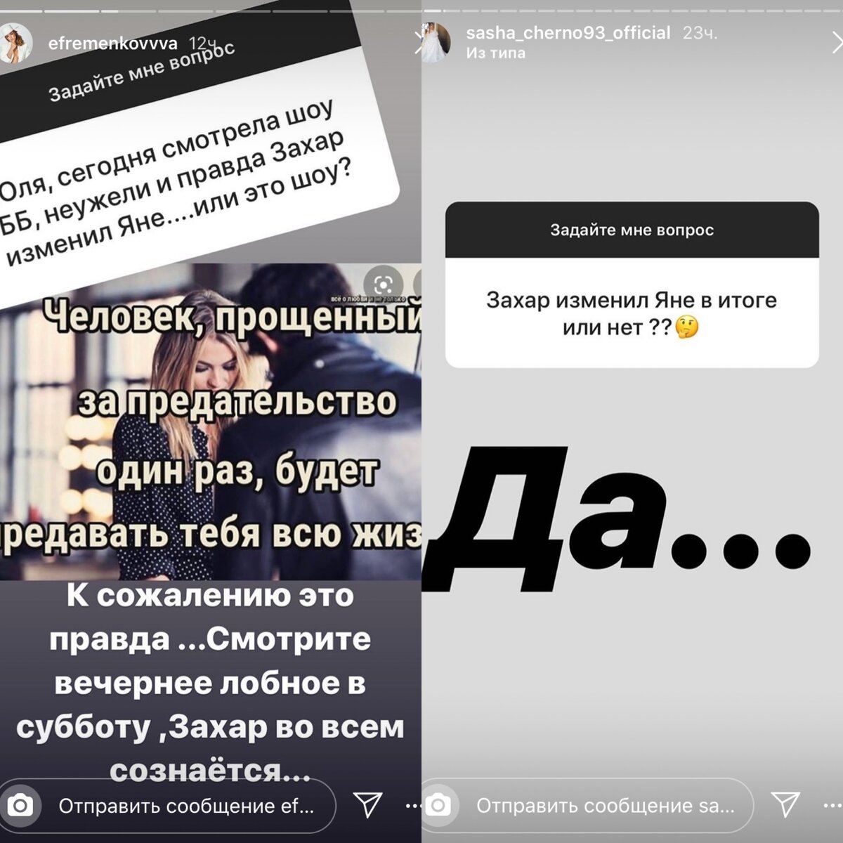 Несколько часов назад ведущая телепроекта Юлия Ефременкова выставила сторис с ответом на вопрос «Юля смотрела сегодня шоу ББ, правда Захар изменил?» - Юля ответила четко и понятно, к сожалению, ДА, смотрите вечернее лобное в субботу 19.10.2019, где Захар во всем признаётся. Также совсем недавно Саша Черно тоже выставила в Инстаграм ответ на вопрос подписчиков, что Захар действительно изменил Яне.