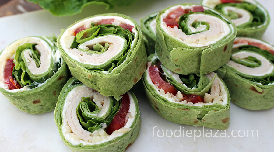 Рулеты из тортильи с индейкой, сыром, помидором и салатом