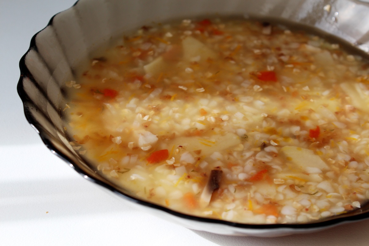 В заморозке у меня были грибы, морковка, укроп я их тоже добавила. Для вкуса можно добавить немного копчёного мяса, но это лишь по желанию. На дно кастрюли я выложила грибы, морковь, укроп и копчёное мясо. Добавила ложку растительного масла. Режем лук, отправляем в кастрюлю. Помидор порезать кубиками, добавить к остальным овощам. Налить в кастрюлю стакан воды. Оставить тушить овощи на 10 минут. Порезать картошку, помыть. Приготовить гречневую крупу. В кастрюлю долить оставшуюся воду. Дождаться кипения. Добавить картофель и гречку. Оставить суп кипеть на медленном огне ещё на 15-20 минут. Суп можно кушать как холодным, так и горячим. Приятного аппетита!